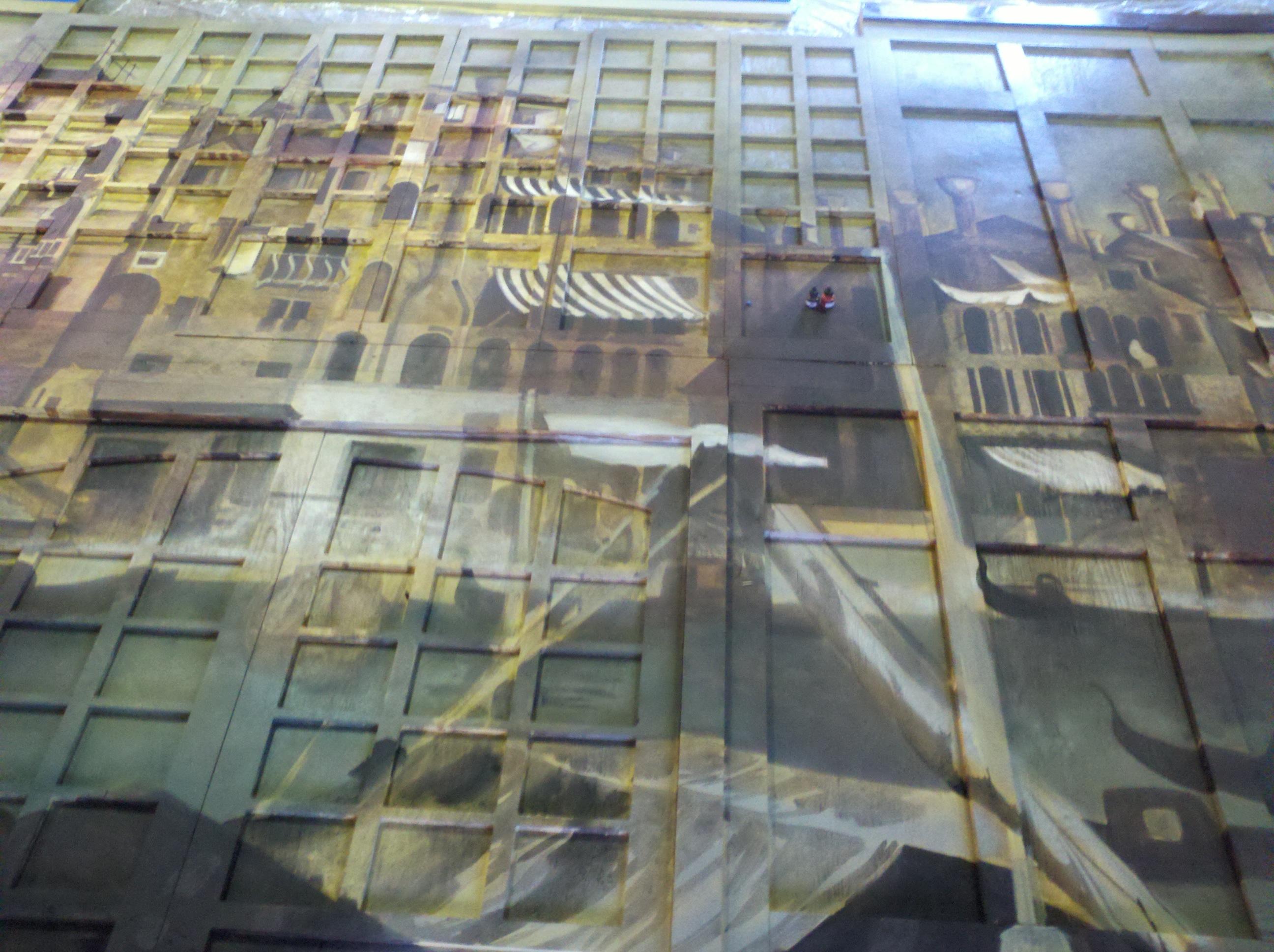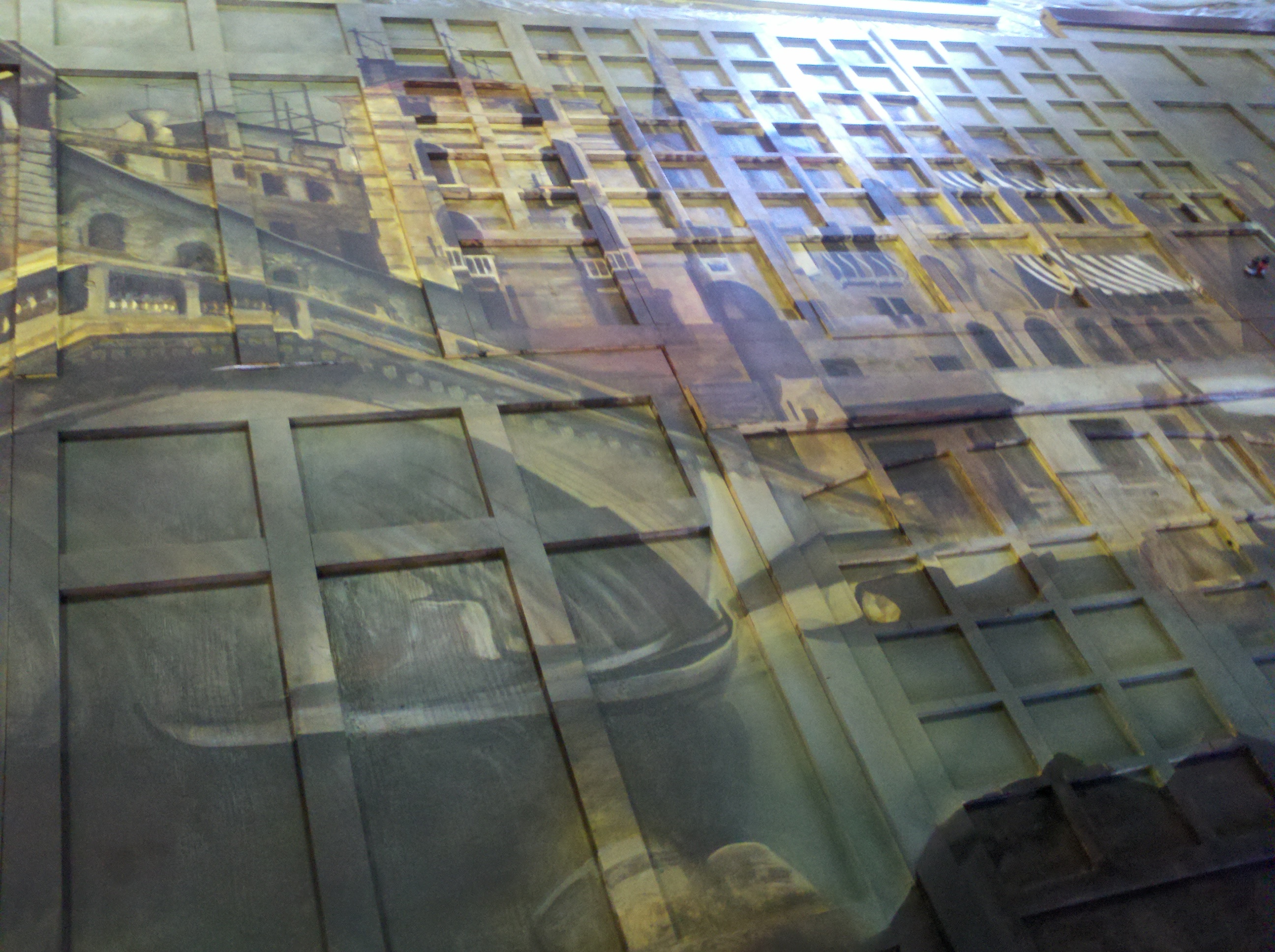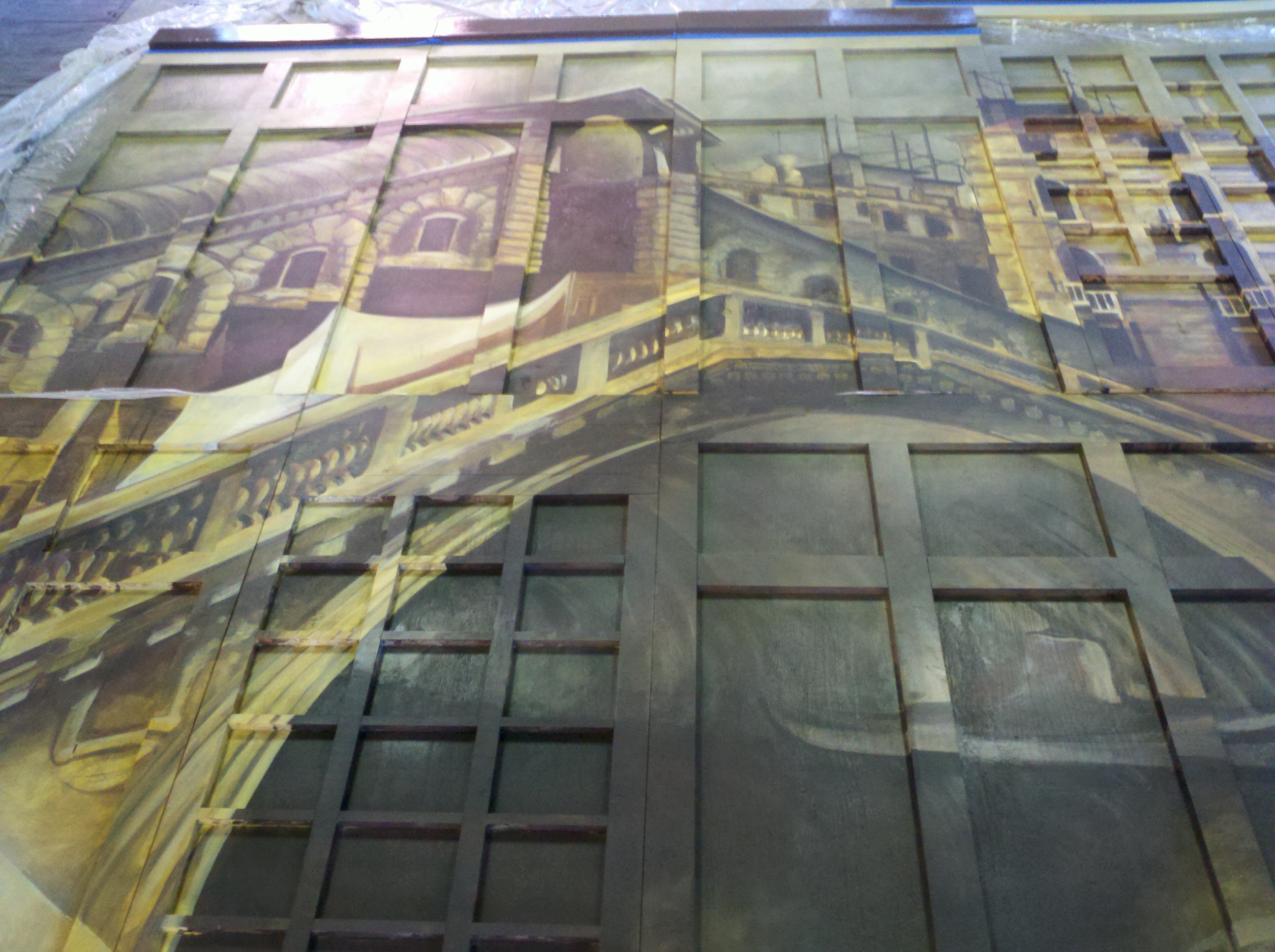 This was a mural that I took the first week off in several years other than holidays to complete. I love to paint and a lot of what I do normally is never this detailed or large. We had just opened a show called Making God Laugh and were well into the build for Little Shop of Horrors which was a metal greenhouse, all of the puppets and several other strange items like an inflatable tongue. Those pictures are in a previous post. Angie Weber Miller is one of the first designers I met in Chicago and she worked at Chicago Scenic Studios at the time. Many years have passed. Yet, of all the things I can get lost in..painting is number one. In the week that I took off, Lauren and I broke up the full seven days into 3 days of layout and basing and 4 days of finishing. Lauren was there just to help me layout the image, and then she had to move onto other projects. Angie and I spent a fun afternoon basing out the 16′ by 30′ image with a warm yellow kilz in the basement of the Mansion out at First Folio.