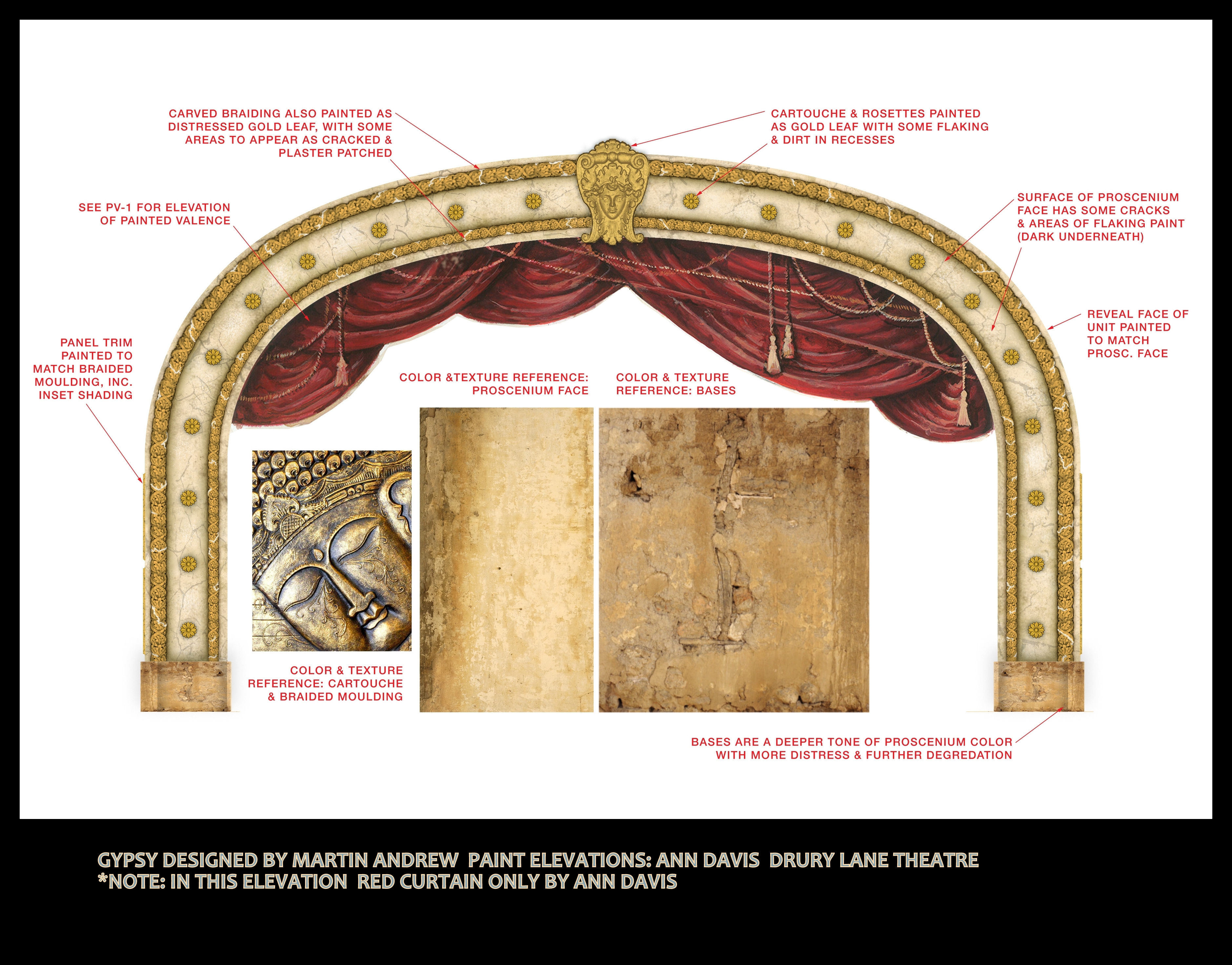 In addition to working as Production Manager and Technical Director, I also do some design and paint work. The Painter’s elevations on Gypsy for Drury Lane were a joy to do. This is the kind of thing I can do late in the evening at my dining room table, put them all in a drop box file, and send them off.