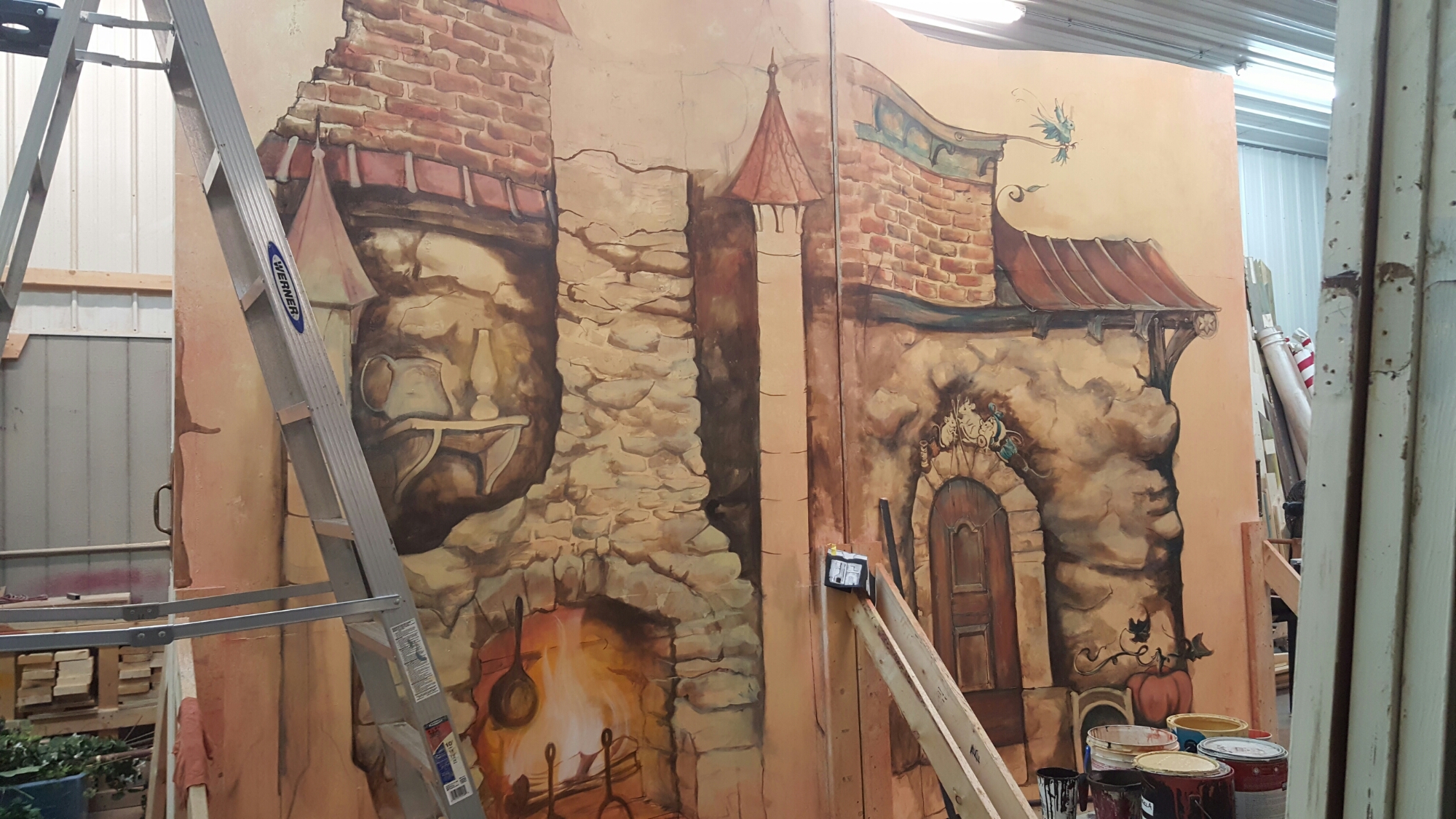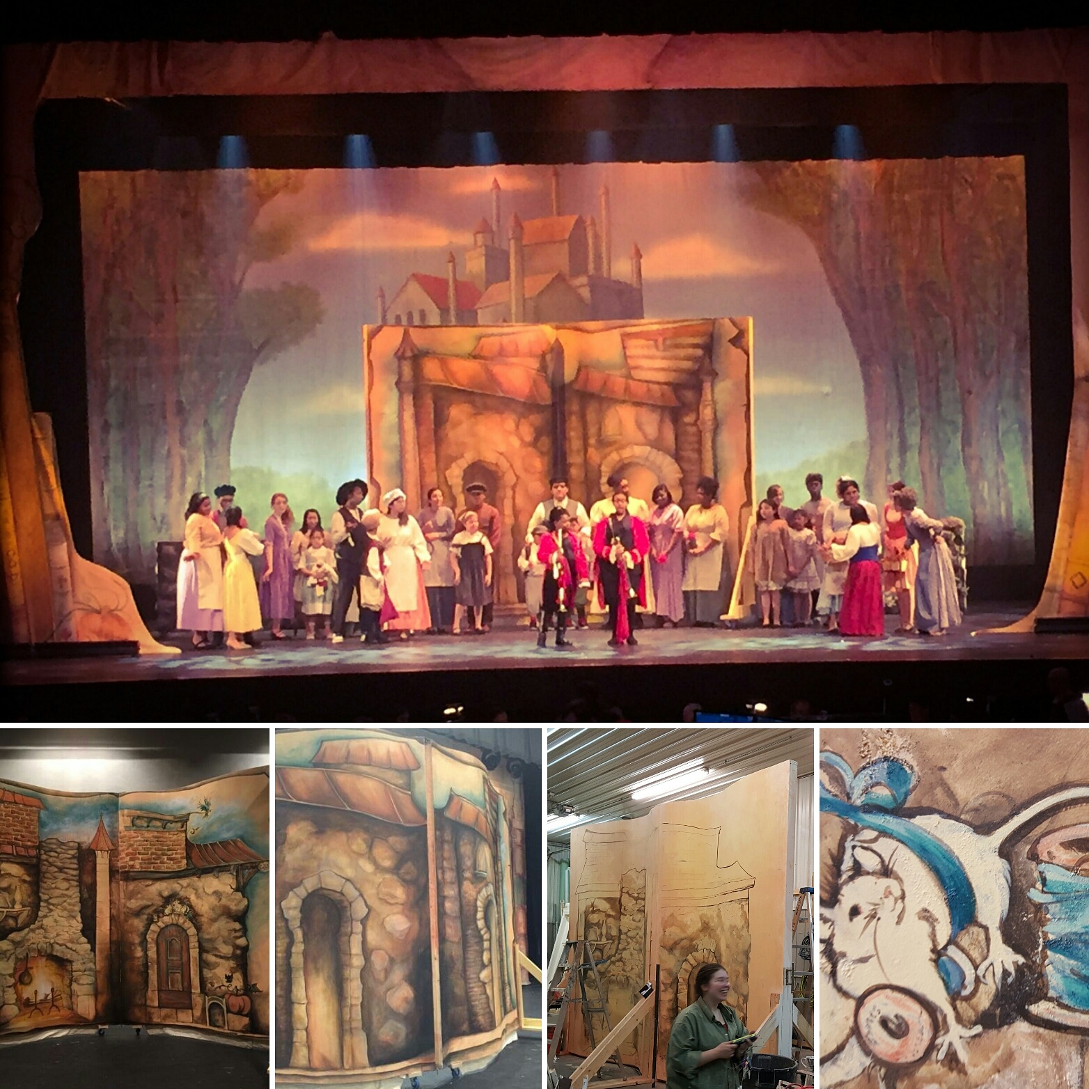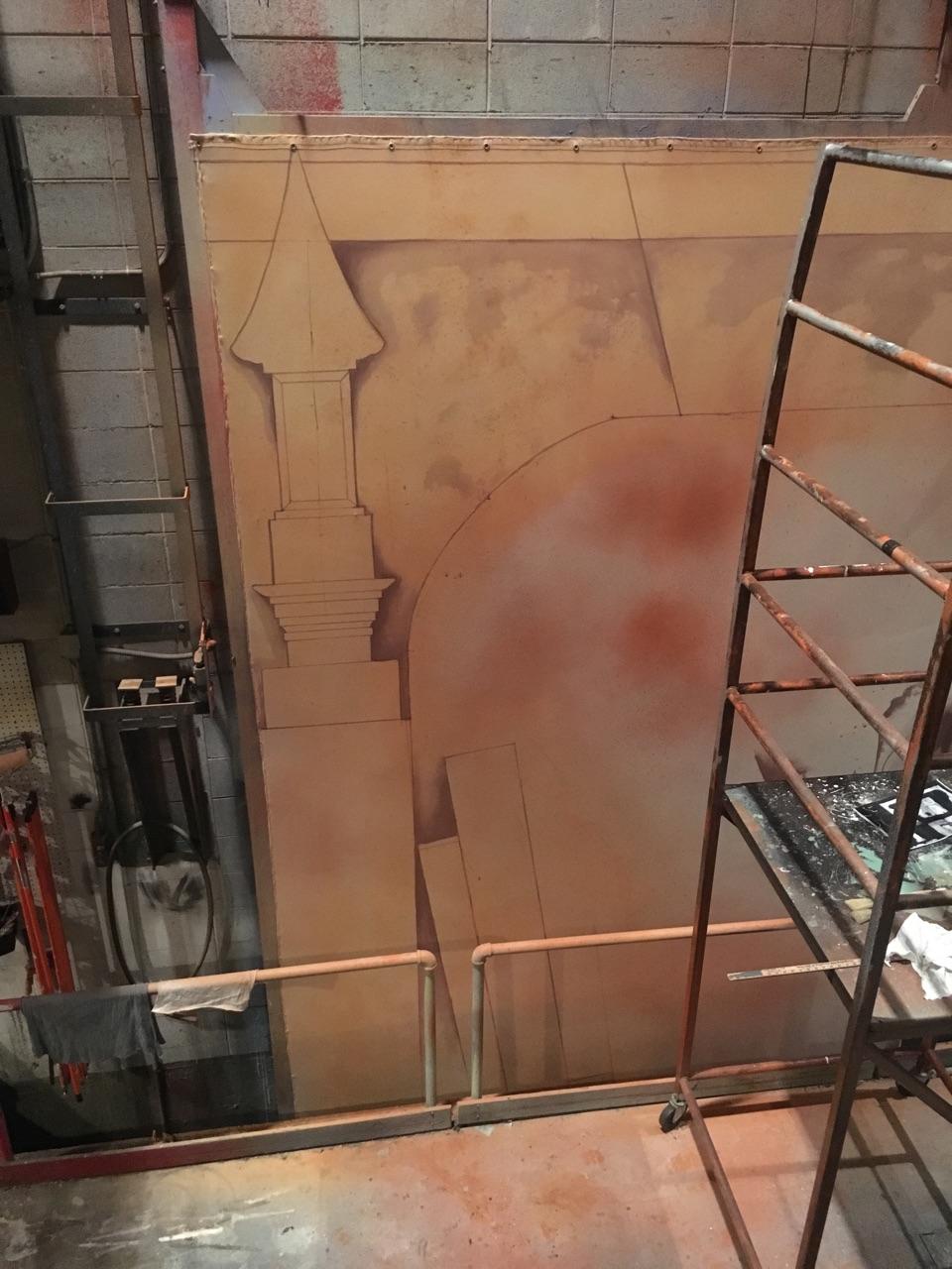 A quick post about our recent collaboration with Hammond Academy for the Arts. Our rolling painted double sided book which articulates in the middle, painted by myself and Jessie Howe, our very talented and organized paint charge. This was surrounded by a soft proscenium painted by Melissa Geel, our shop Foreman and Brittney O’Keefe, our props master. The book was put together by our ATD Dennis Galbreath with the carpenters (Bottger brothers, Aaron Wigsmoen, David Van Weiren, Angelo Nicastro, and David Broughton who also helped with paint) as we teched TATC’s run of 39 Steps. It was built out of very basic materials left over in our shop and clad in 3/8″ bendy ply, filled and primed. The unit was then castered with a simple pivot at top and bottom formed of flat plate steel secured by a rated bolt at top and bottom. The backdrop upstage was rented from Grosh.